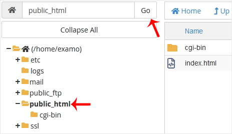 3. In cPanel File Manager, navigate to the directory where you want to upload your files to. For example, should you wish to upload your files to the public HTML directory, you must first go to /public_html. On the left side, in the list of directories, double click on the public_html directory.